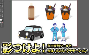 今回のYouTubeはイラレの解説動画で「影つくろ!」です。イラレで影をつけたい時の解説動画です。使うのは自由変形ツール(自由変形、遠近変形、パスの自由変形)。それからパスファインダーの合体、さらに効果にあるボカシ2種類 […]
