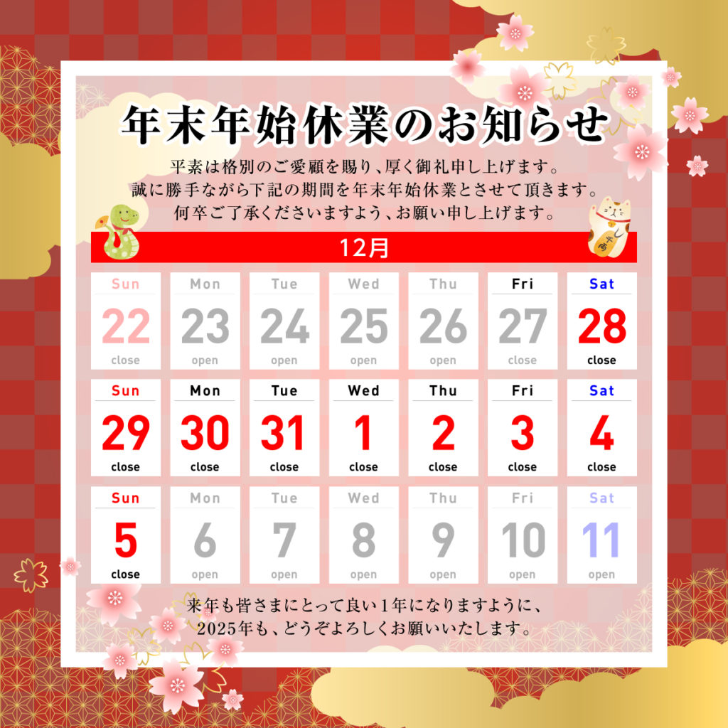 年末年始休業のお知らせ 2024年12月10日 最終更新日時 : 2024年12月10日 D-studio 2024年12月28日(土)〜2025年1月5日(日)まで、誠に勝手ではございますが、お休みさせて頂きます。お客様には大変ご迷惑をお掛け致しますが、何卒ご了承のほどよろしくお願い申し上げます