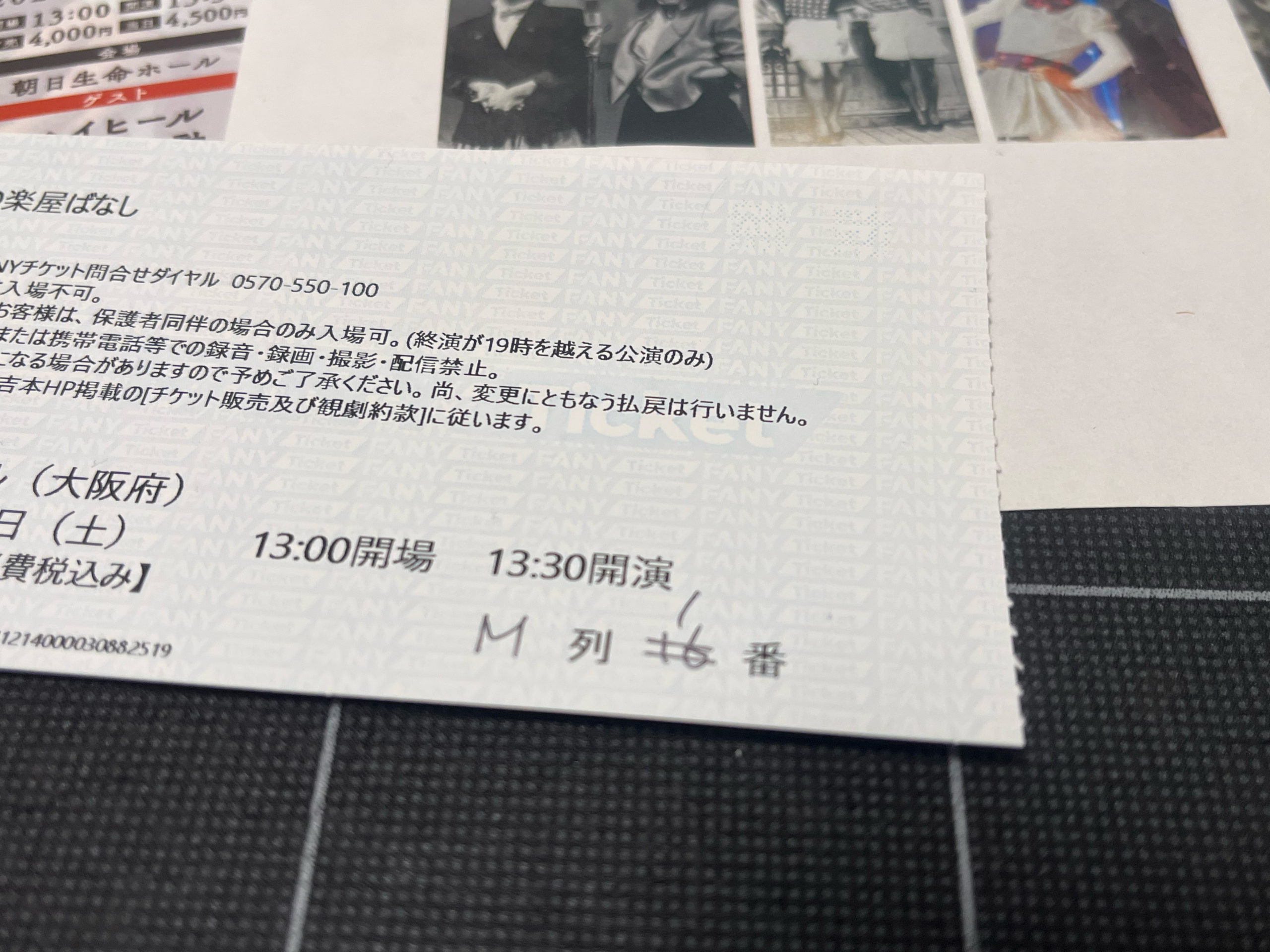 まず当日券で入場したのですが、空いている席で案内された場所には先客あり。えっ!となって確認したのですが、どうやら既に埋まっている席を案内されたらしく再度売店へ。そこで「すみません、ここで良いですか?」と言われたのがMの1番という番号でした。くしくも明日はM-1グランプリがあります。これは縁を感じるので明日は見ないといけないかな(笑) まあ、そんな事を言っても毎年見ているのですが、なんか不思議な縁を感じる出だしでした。