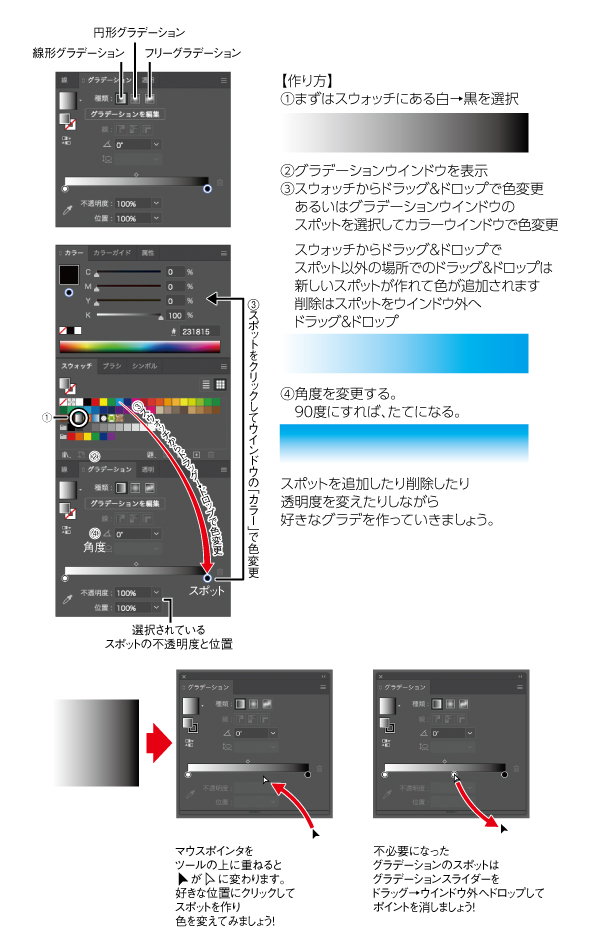 私の場合はまずスウォッチにある白黒のグラデーションを選択してから、グラデーションのウインドウを使って作っていきます。作り方は動画でも説明しておりますが、スウォッチから色を選んでドラッグ→ドロップでグラデーションウインドウのスライダーの上に重ねる方法、あるいはグラデーションウインドウのスライダーにあるスポット(分岐点)を選択してカラーウインドウで数値入力する方法で色と付けていきます。